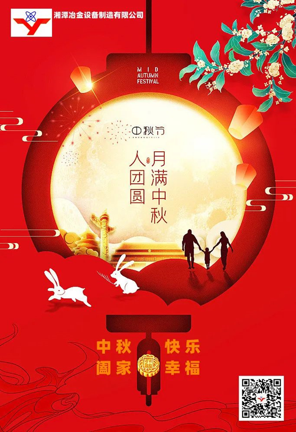 值此中秋佳節(jié)到來(lái)之際,湘潭市冶金設(shè)備制造有限公司謹(jǐn)向一直陪伴公司成長(zhǎng)、不離不棄的各界朋友、合作伙伴、全體家人們致以深深的感謝與崇高的敬意,并祝大家:節(jié) 愉 快!月圓人圓家圓圓圓滿滿